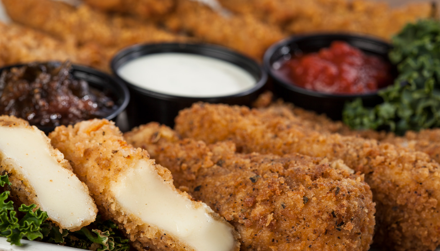 Bloques gigantes de nuestro queso mozzarella fresco fritos en nuestro empanado casero.