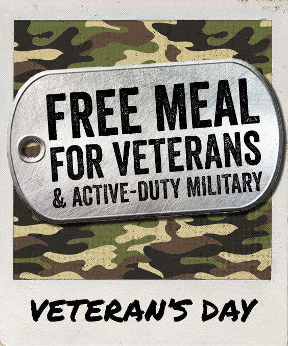 Celebre el Día de los Veteranos con una COMIDA GRATIS* para veteranos y militares en activo. Solo para cenar, miércoles 11 de noviembre de 2025.